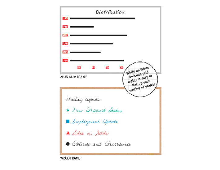 Eliminate slanted writing with this 1" x 1" ghost grid, magnetic dry-erase white steel surface. Grid is not visible from a distance. Perfectly align charts, lists, columns and graphs.